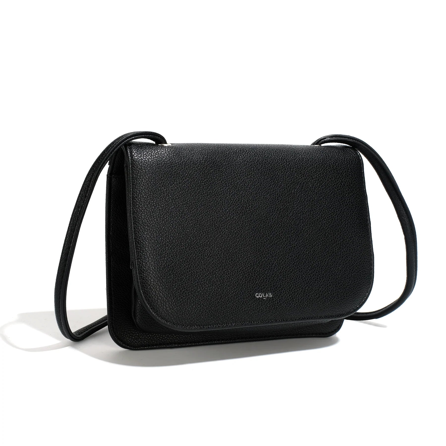 Recycled Pebble Vegan Leather, flap closure with magnet, long crossbody strap.
