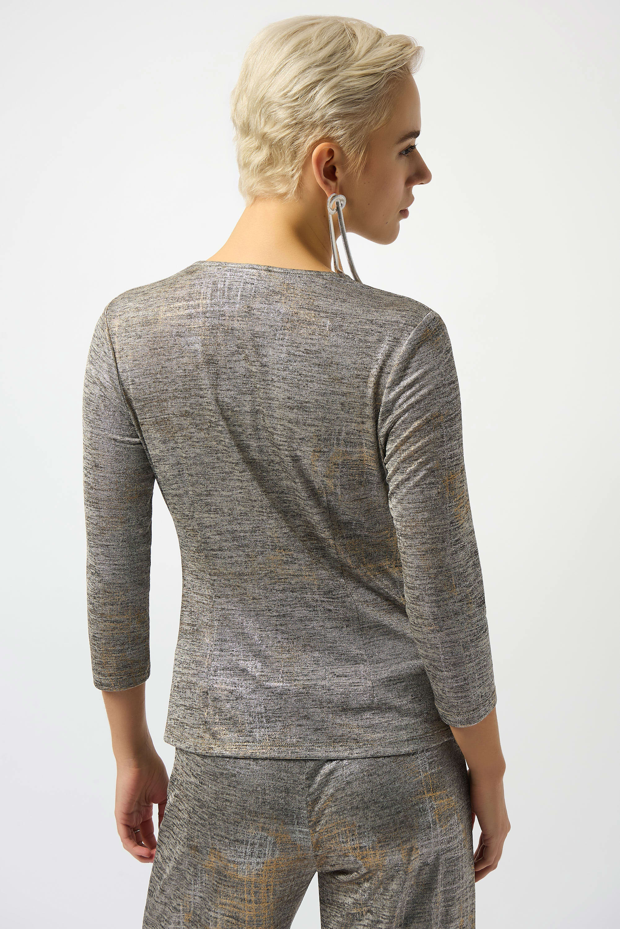 Showcase your distinctive style with this striking foiled mélange knit top. The wrap neckline adds a sophisticated twist, while the abstract print lends a dramatic flair to the design. The three-quarter sleeves and front pleat detailing enhance the flattering fit, making this top effortlessly chic.