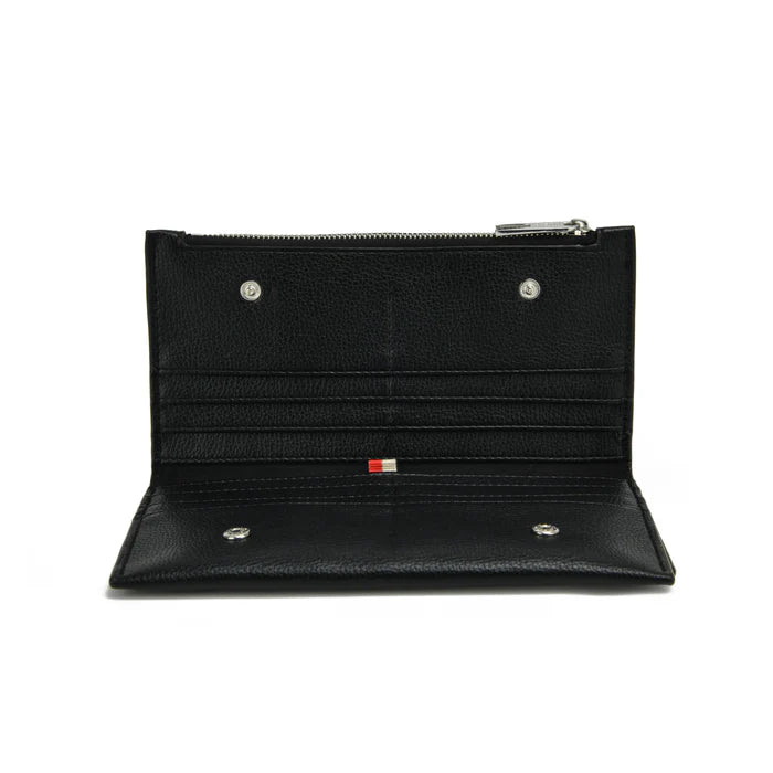 This sleek wallet holds 12 Card Slots, 2 Bill Slides and a zipper pocket.