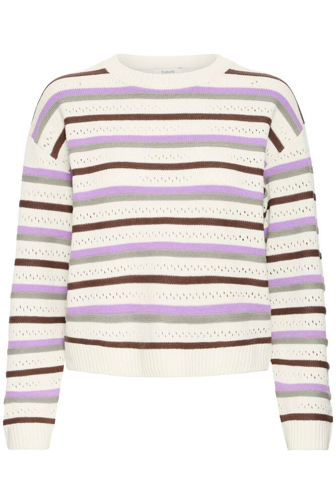 Effortless layering meets laid-back style with this striped pointelle knit. The lightweight construction keeps you comfortable whether you're heading to brunch or running errands, while the textured weave adds visual interest without the bulk. Wear it with our Dalano Drawstring Pant and our Parza Short Trench Jacket; the perfect spring look.