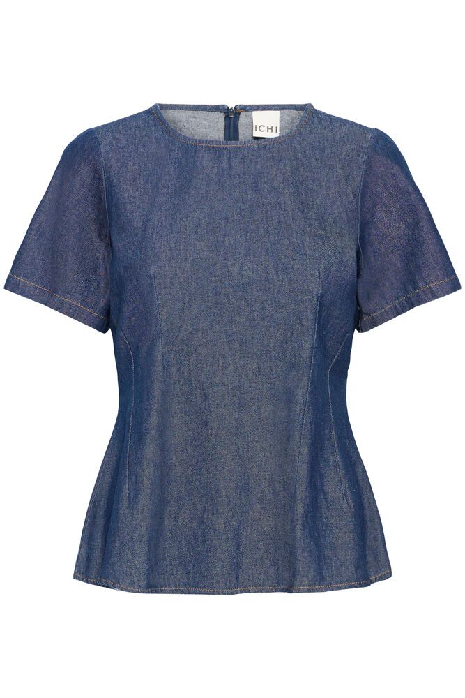Denim top with round neckline, short sleeves, and tailored seams. Fitted silhouette and back zip closure add crisp structure to the look. Wear it with our Cropped Straight Leg Stretch Jeans and accessorize with our Viflora Flower Belt.