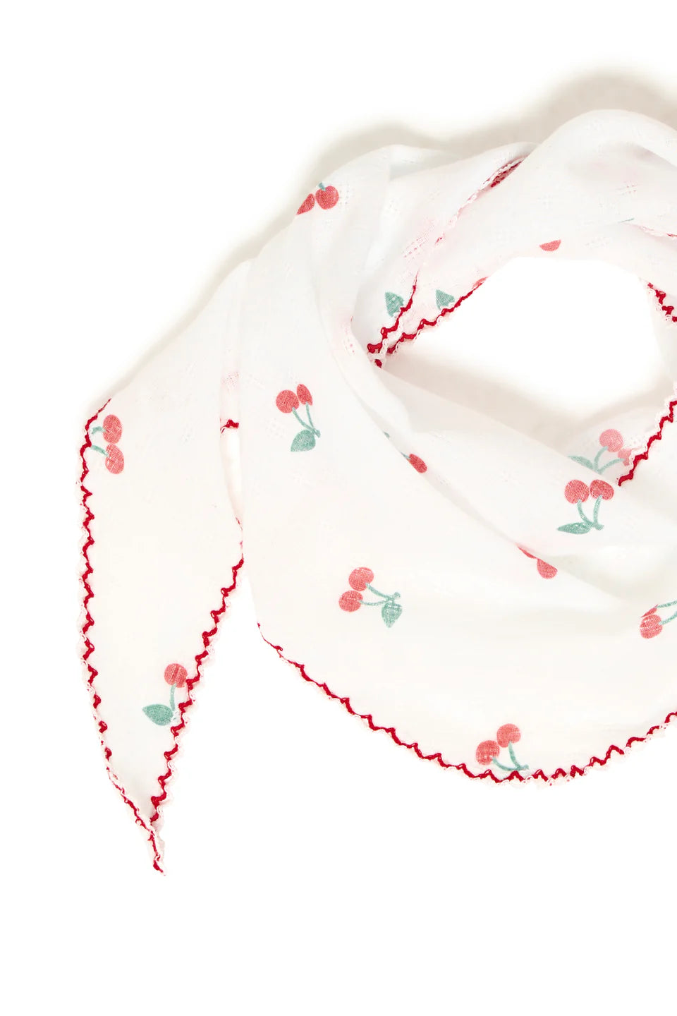 A playful, feminine accessory designed to add a cheerful pop of colour to any outfit. The Cherry triangle scarf in features a charming cherry print scattered across a soft off‑white base, creating a fresh, uplifting look perfect for spring and summer. Its lightweight fabric drapes beautifully, making it easy to style around the neck, in the hair, or tied to a bag for a fun seasonal accent. Pairs perfectly with our Cable Knit Skater Dress.