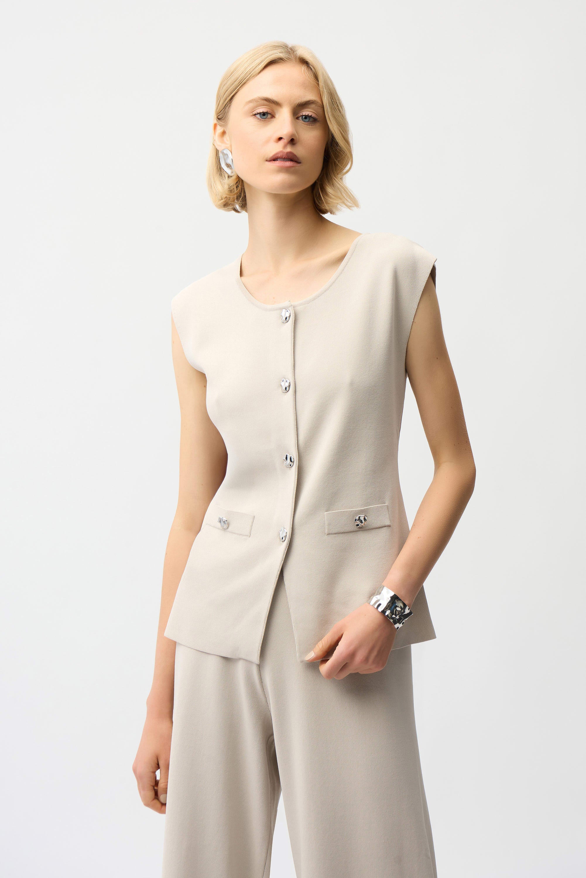 This dry viscose and nylon full needle vest features a fitted body and a crew neck. Faux welt pockets and hammered nickel metal buttons complete the look, adding a polished touch to this sleeveless piece. Pairs perfectly with the matching pants, Viscose Blend Culotte Pants.
