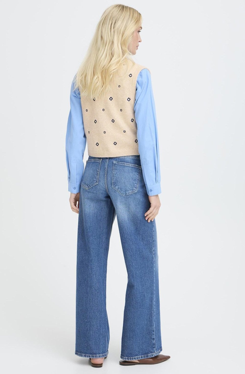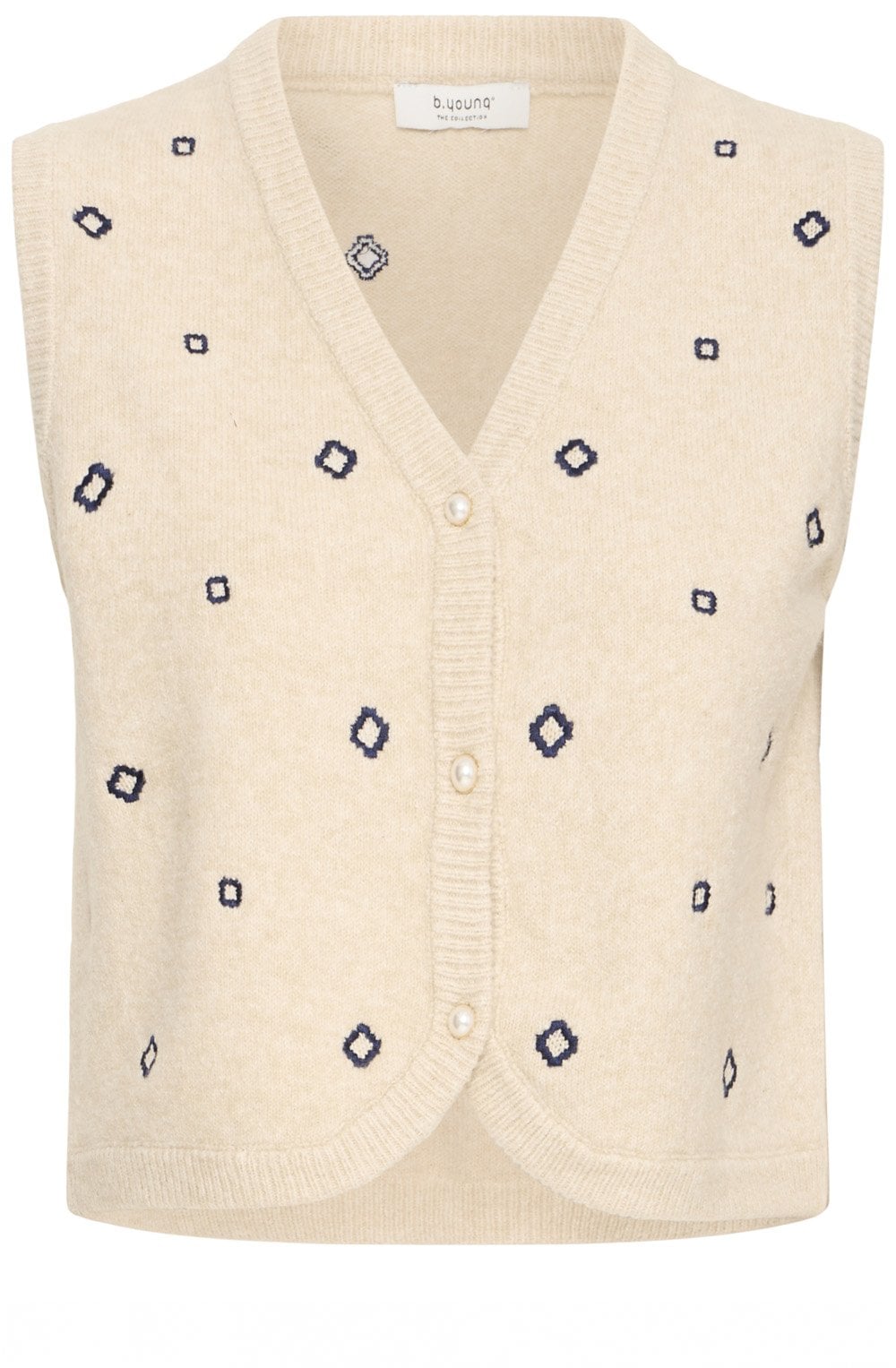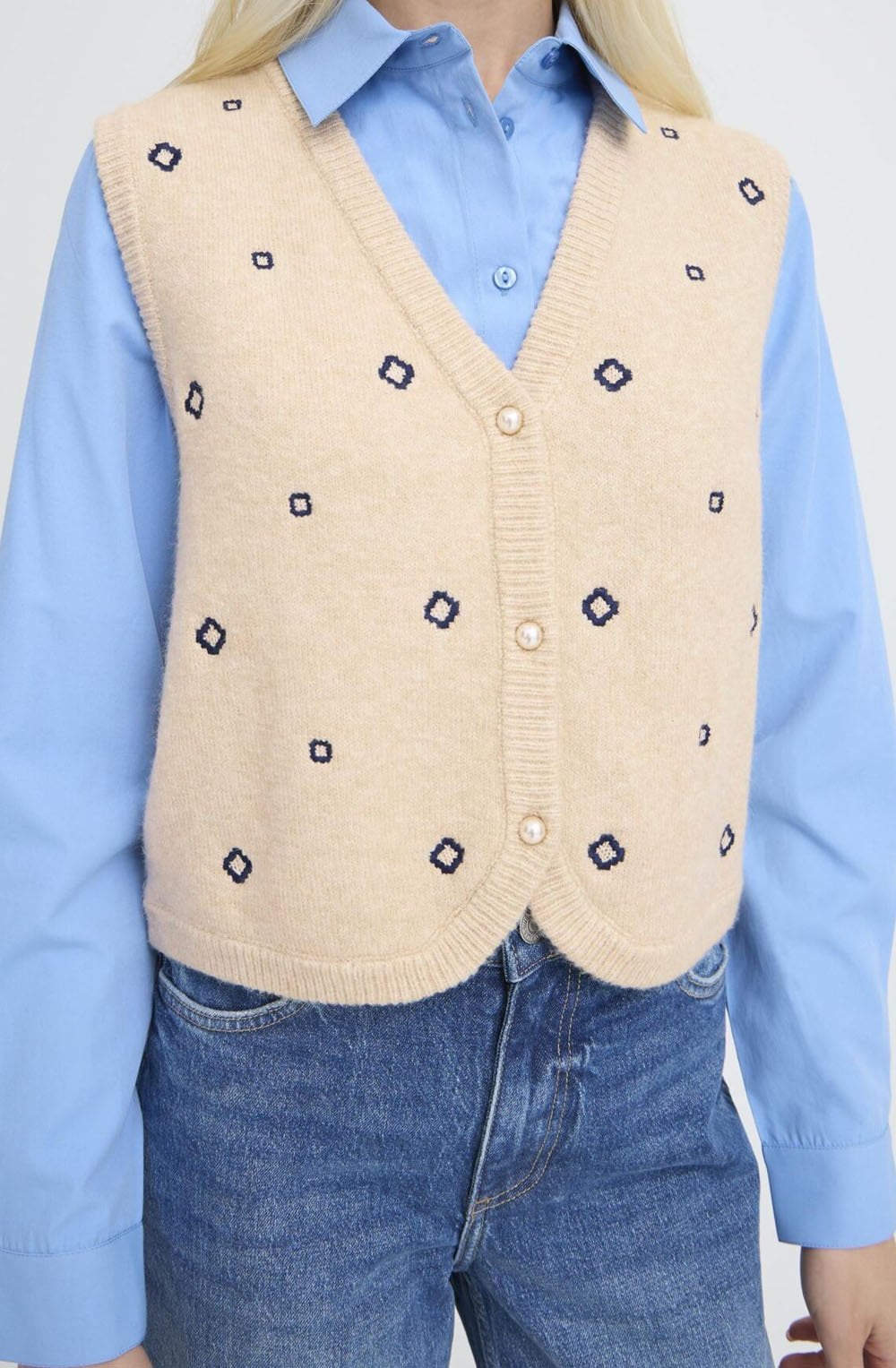 This buttoned vest features a fitted silhouette with a deep V-neckline and sleeveless design. Decorative geometric details are visible across the entire vest, which has a soft texture and ribbed edges at the hem, neckline, and placket.