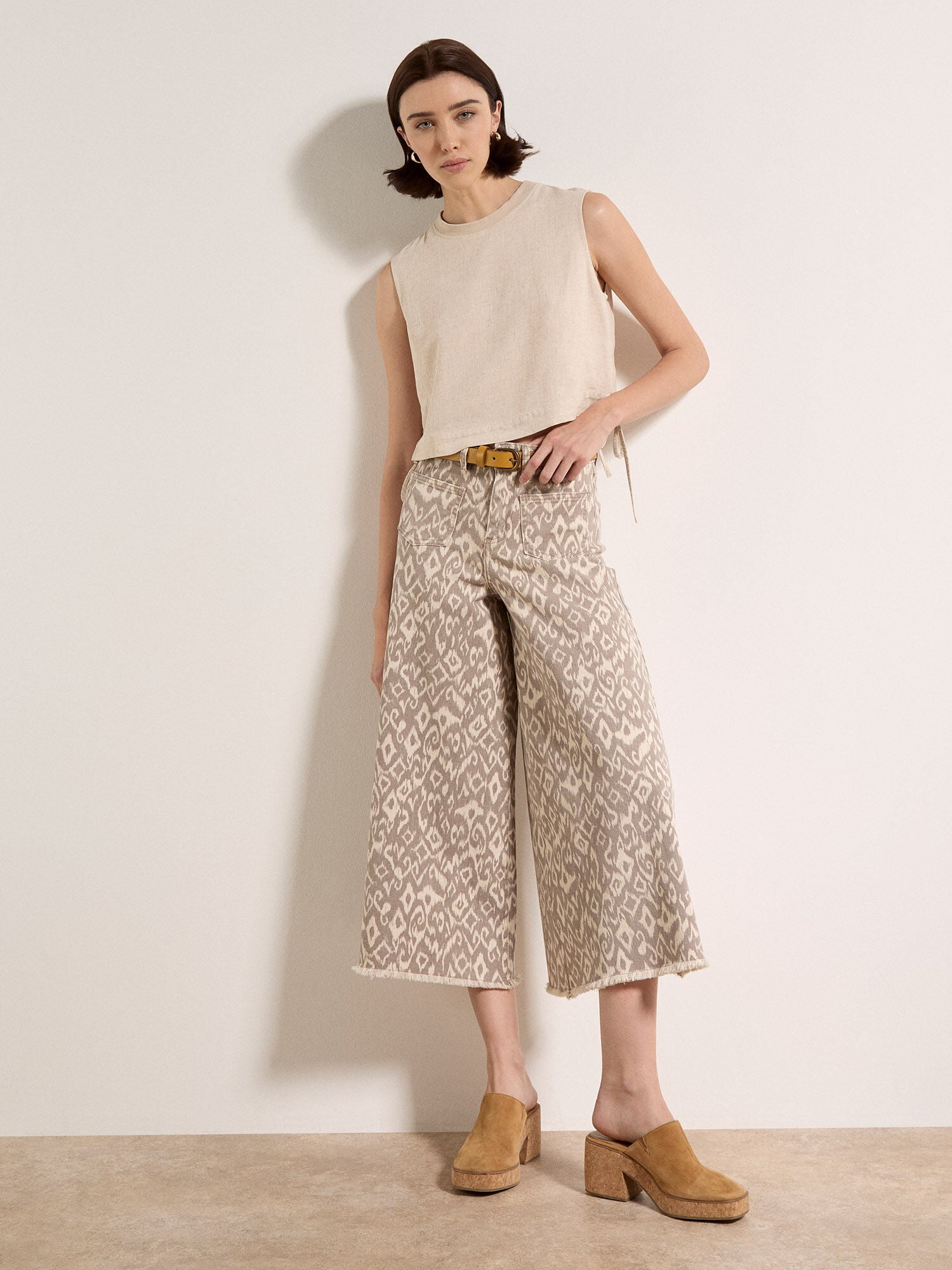 Add a pop of print to your denim collection with the Gianna jeans. Decorated with an ikat design, they feature a wide-leg cut with a slightly cropped length, plus patch pockets at the front and back. Style them with heeled ankle boots and a camisole for city strolls, brunch dates, and all your summer plans.