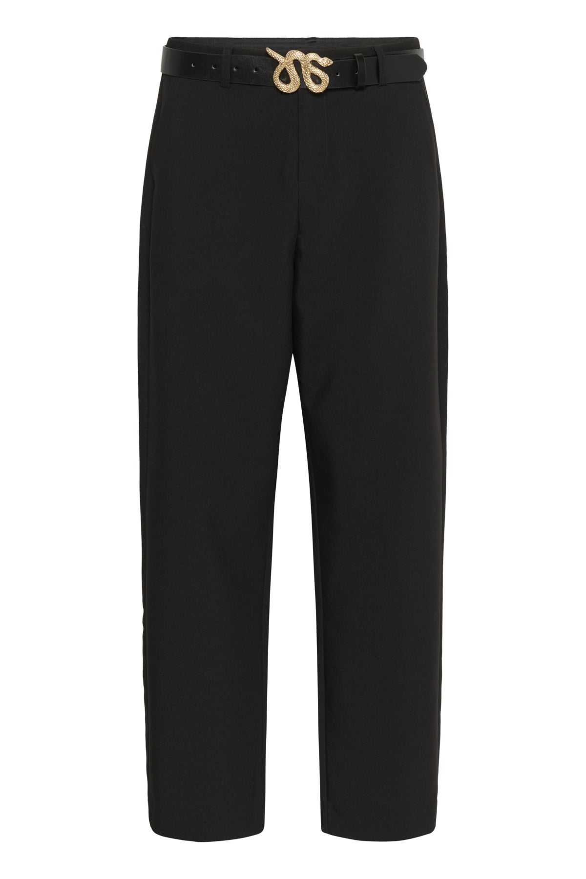 Tailored trousers offer a modern fit, featuring a mid-rise waist and straight leg silhouette. The design includes practical pockets and a stylish belt with a unique buckle, ensuring comfort and versatility for work or casual events.